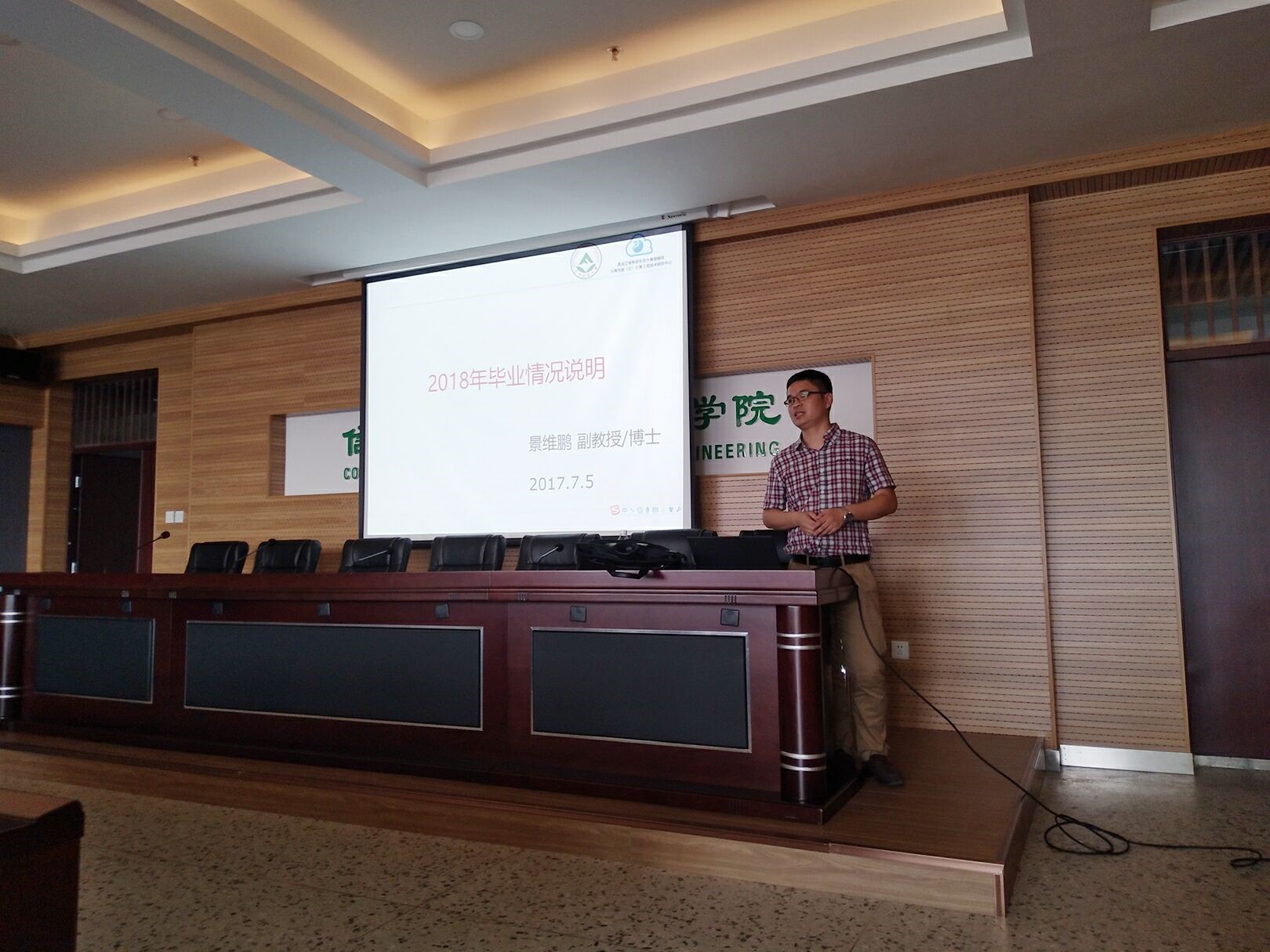 2017年7月6日上午9时信息公司在成栋楼1016学术报告厅召开研究生毕业要求说明会。参加会议的有信息公司副经理景维鹏、研究生辅导员李婧坤和2018年即将毕业的博士、硕士研究生。