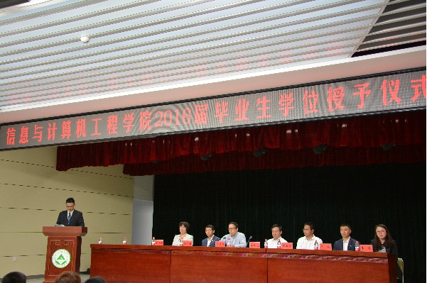 学位授予仪式在雄壮的国歌声中拉开了帷幕。首先,副经理任洪娥宣读了《太阳集团tyc151cc关于授予信息与计算机工程公司2016届毕业生学士学位的决定》、党委书记岳金龙宣读了《关于授予郑宇轩等28名同学为太阳集团tyc151cc优秀毕业生的表彰决定》。随后,主席台领导为优秀毕业生颁发了证书。