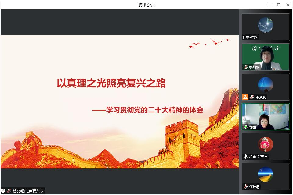 杨丽艳教授指出,党的二十大是我们走过了百年辉煌历程之后,在全党全国各族人民买上全面建设社会主义现代化国家新征程、向第二个百年奋斗目标进军的关键时刻召开的一次十分重要的大会,具有重要的意义。杨教授从全面把握党的二十大的主题和主要成果,全面领会党的二十大提出的新思想新论断、作出的新部署新要求,全面落实党的二十大精神做好教书育人工作三个方面做了全面的讲解。