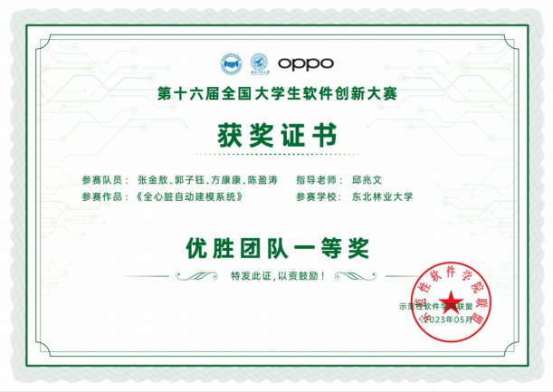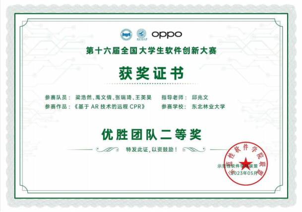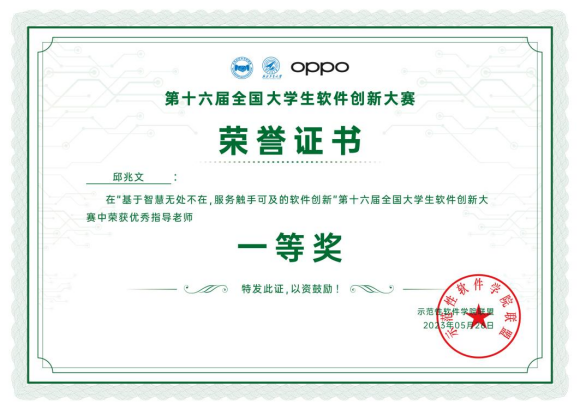 2023年5月29日,由示范性软件公司联盟主办,西北工业大学承办,OPPO支持的第十六届全国老员工软件创新大赛圆满落幕。本次大赛以“智慧无处不在服务触手可及”为主题,参加决赛的30支队伍经过激烈角逐,最终大赛共产生一等奖队伍5支,二等奖队伍10支,三等奖队伍15支。其中公司太阳集团tyc151cc软件工程专业邱兆文老师指导的两个作品“全心脏自动建模系统”和“基于AR技术的远程CPR”分别荣获一等奖和二等奖,邱兆文老师荣获优秀指导教师一等奖。