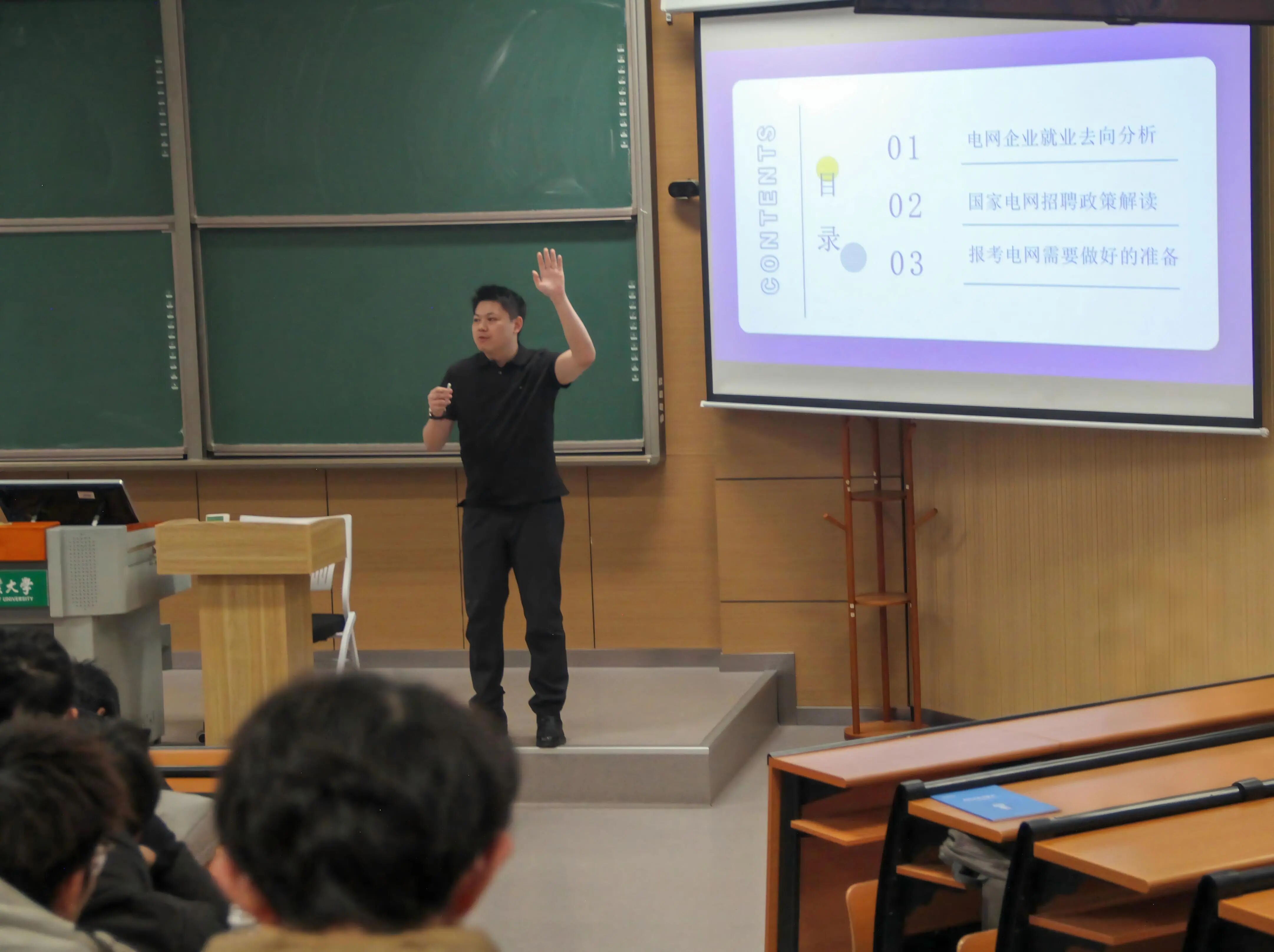 讲座伊始,主讲人立足电力行业发展趋势,深入解读了电网系统作为“电气人”核心就业方向的稳定与高薪优势。他结合国家电网“总部+分部+省市单位+直属单位”的完整组织架构,详细拆解了输电、配电、变电、营销四大核心班组的岗位职责——从66千伏输电线路运维、10千伏城市配网检修,到变电站设备维护、政企用电服务,全面呈现不同岗位的工作场景与能力要求。此外,他还通过详实数据讲解了不同地区、不同单位性质(供电、省直属、城郊供电等)的薪酬结构,包括基本工资、绩效薪酬及六险二金、工会福利等薪资待遇,帮助学子们兼顾职业发展与生活需求。