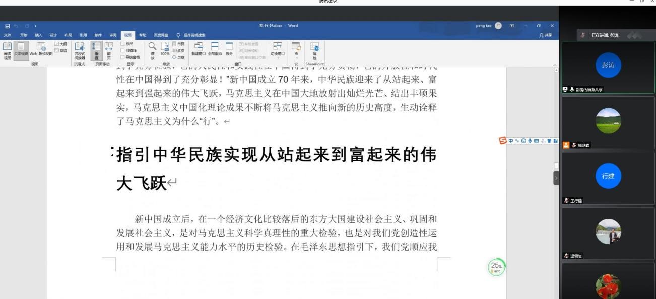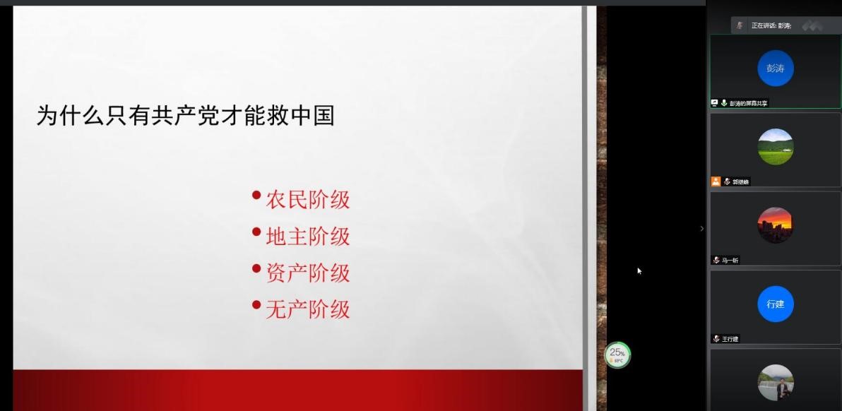 彭涛同志利用网络屏幕共享,以图文并茂的方式讲述了中国历史上几次著名的农民起义和革命运动,利用理论结合实际的论述方法,深入浅出地把为什么只有中国共产党才能救中国的道理讲的透彻深刻,并与大家分享了“马克思主义为什么‘行’”、“中国共产党为什么‘能’”、“中国特色社会主义为什么‘好’”等三篇人民日报的理论文章。