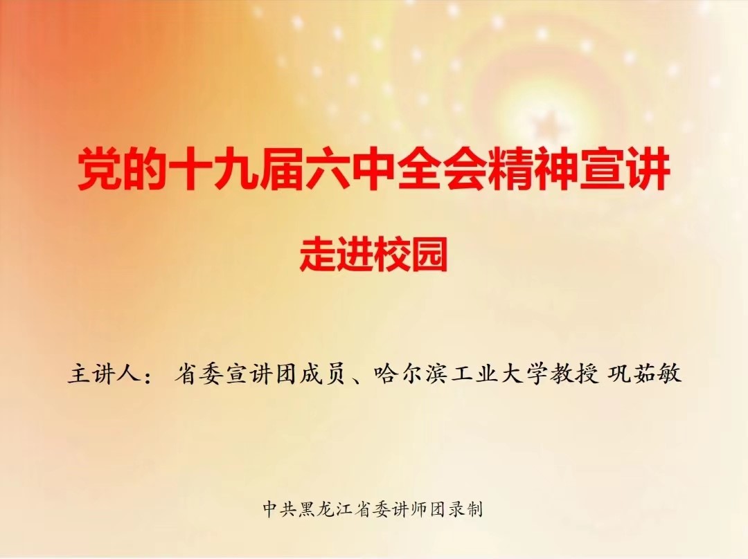 次宣讲会由省委宣讲团成员、哈尔滨工业大学教授巩茹敏为大家进行宣讲,会议对全会精神特别是习近平总书记的重要讲话精神作了深入阐释,本次宣传会主要分为四个部分,一是十九届六中全会的总体概况,二是十九届六中全会涵盖的主要内容,三是十九届六中全会彰显的鲜明的亮点,四是十九届六中全会带来的思考与启示。