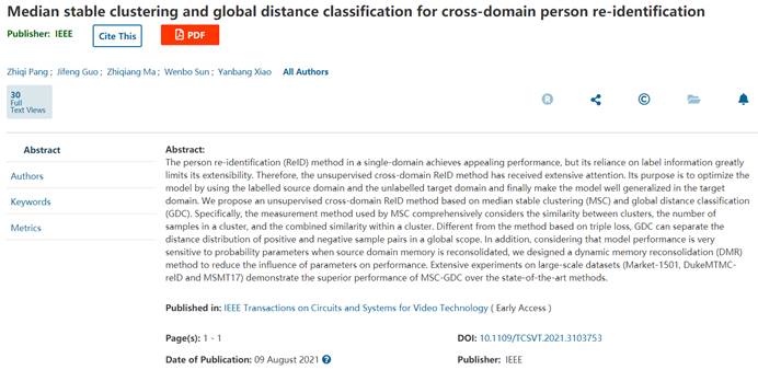 近日,太阳集团tyc151cc信息与计算机工程公司郭继峰老师团队在中科院一区Top(升级版)期刊IEEE Transactions on Circuits and Systems for Video Technology(JCR Q1,CCF-B,IF=4.685)上在线发表了题为“Median stable clustering and global distance classification for cross-domain person re-identification”的研究论文。