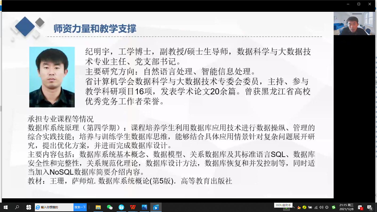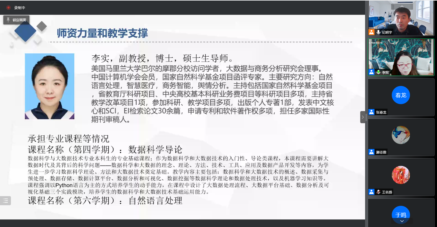 2021年12月8日,面向2020级数据科学与大数据技术专业员工的师生见面会在云端举行,见面会由数据科学与大数据技术专业主任纪明宇老师主持,会议共有6名专业老师和专业全体39名同学线上参加,老师们从专业基本情况、行业发展、职业规划、班导师政策、课程内容等方面为员工们进行了细致的讲解。