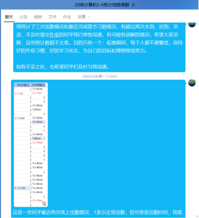 此过程主要利用授课QQ群、布置的各类作业批改及学习中心讨论主题为员工答疑解惑。通过腾讯会议参会数据统计监督员工出勤情况,并及时向员工反馈。答疑及学习情况反馈方式如图7、图8所示。