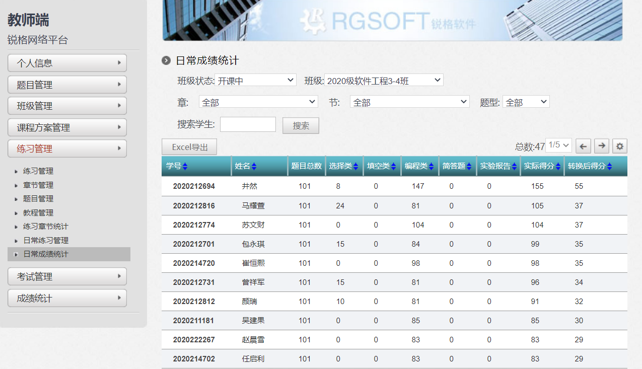 (4)在课后利用公司的瑞格系统,布置相关程序练习题和实验,员工可线上提交代码,系统自动检测和运行代码,并及时提交结果反馈给员工。平台可有效的提高员工编程实践能力,同时根据统计了解员工编程完成情况。
