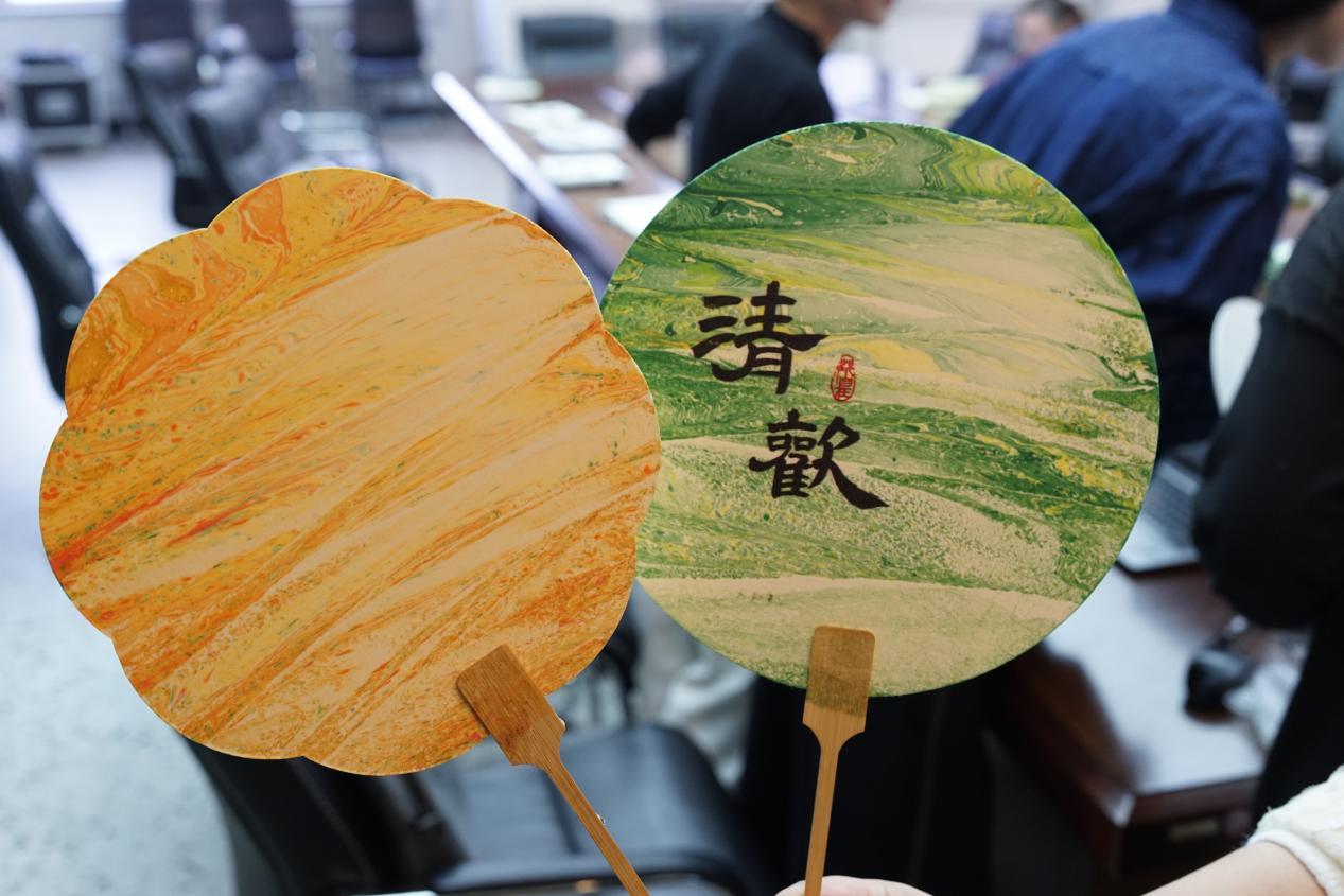 进入漆扇制作环节,辅导员老师们纷纷挑选自己心仪的扇子和搭配的大漆颜色,将扇子缓缓浸入颜料中,伴随着左右摇晃或轻微旋转,扇面呈现出多变的纹路,形成了独一无二的漆扇。尽管手法略显生疏,但大家都沉浸其中,深切体会到了非遗技艺传承的不易与乐趣。
