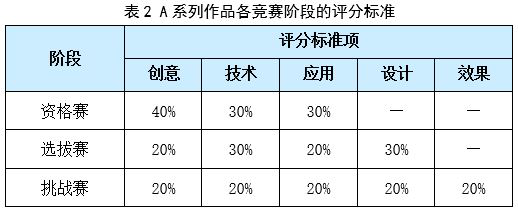 竞赛分为三个阶段:资格赛、选拔赛与挑战赛。竞赛各阶段的作品形式与评审形式见表1。A系列作品的评价标准见表2,B系列作品的评价标准参见本规程附件中的相应赛项指南,C系列的评价标准参见后续发布的“创业(C)系列项目指南”。