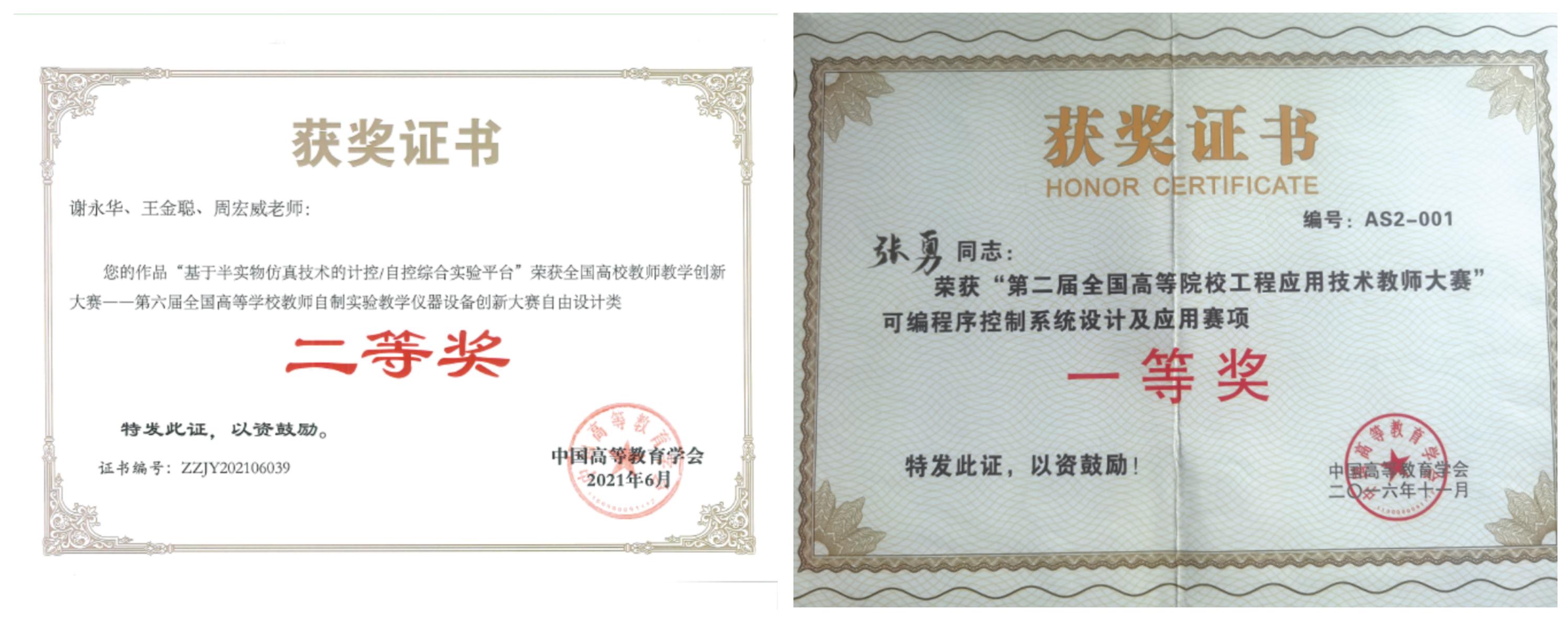 实验室承担省部级实践教学改革项目9项,老员工创新项目20余项,自制设备校级立项4项,自制实验教学仪器72台套,编著配套教材3部,自制设备获国家级奖项1项,获专利3项。其中,《自动控制原理》、《计算机控制技术》、《可编程控制器课程设计》、《自动化实训》、《现场总线》课程均由自制设备支撑教学。